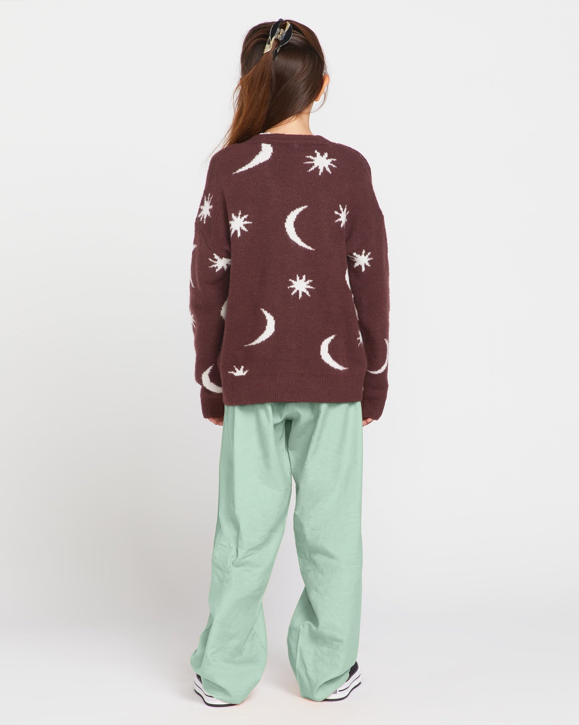 She'll stay cozy under the stars in the Nyte Stone Cardigan. This celestial-patterned jacquard sweater features a solid rib knit and front button closure for effortless layering. The acrylic-nylon-elastane blend provides warmth and stretch for all-day comfort. It's the perfect celestial-inspired cardigan for cool nights. Featured here in brown.