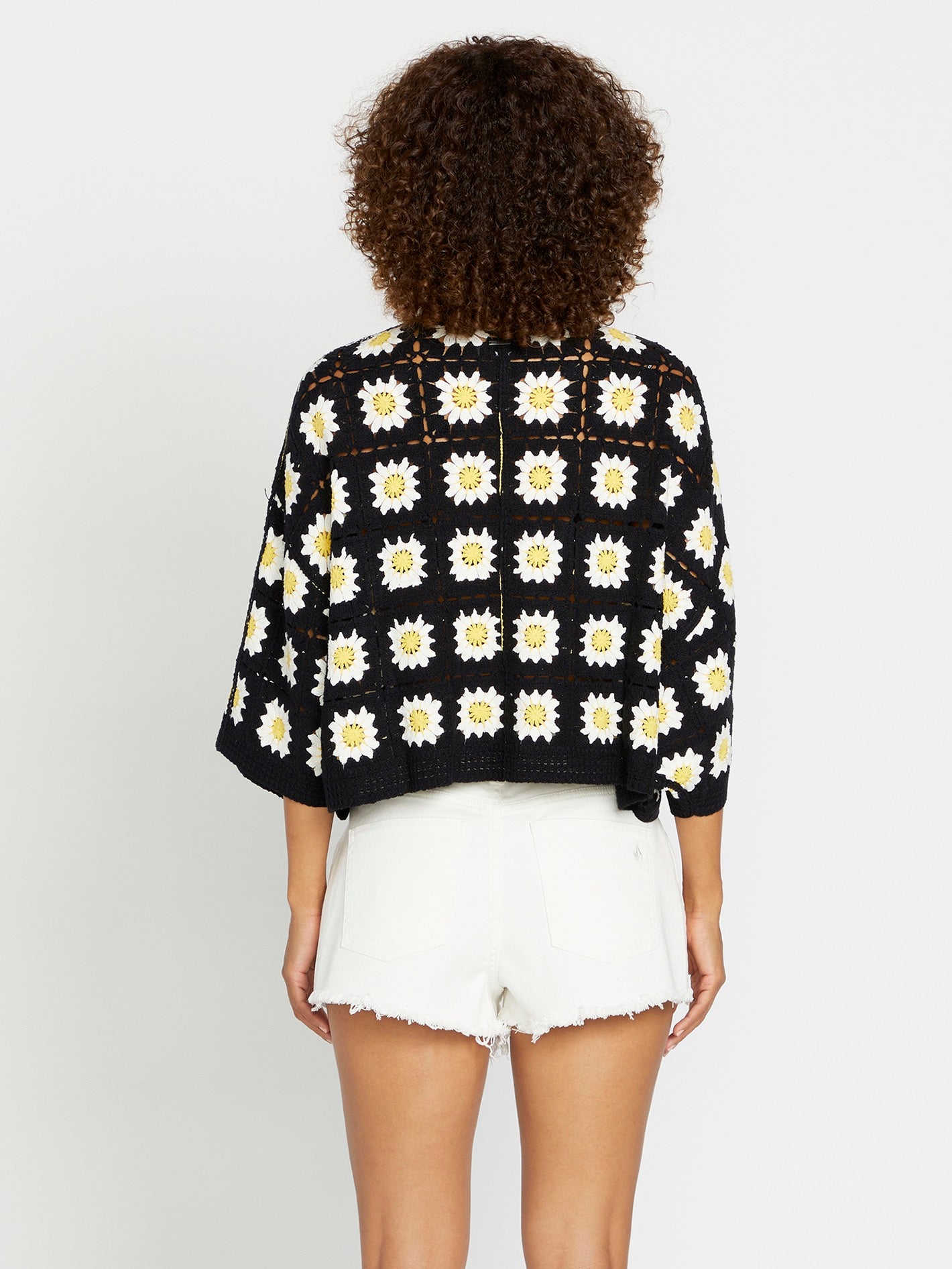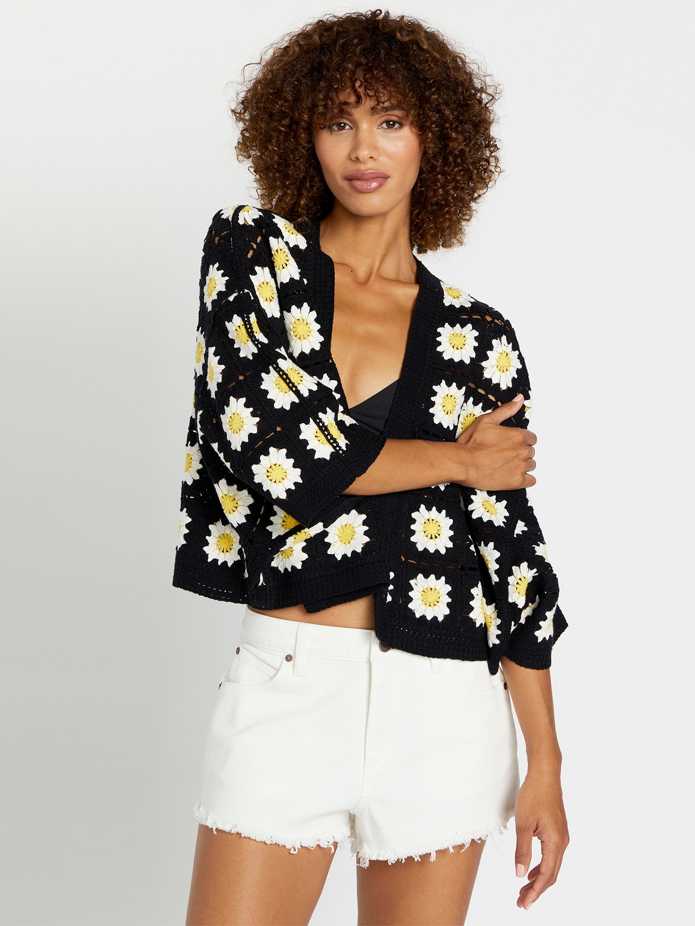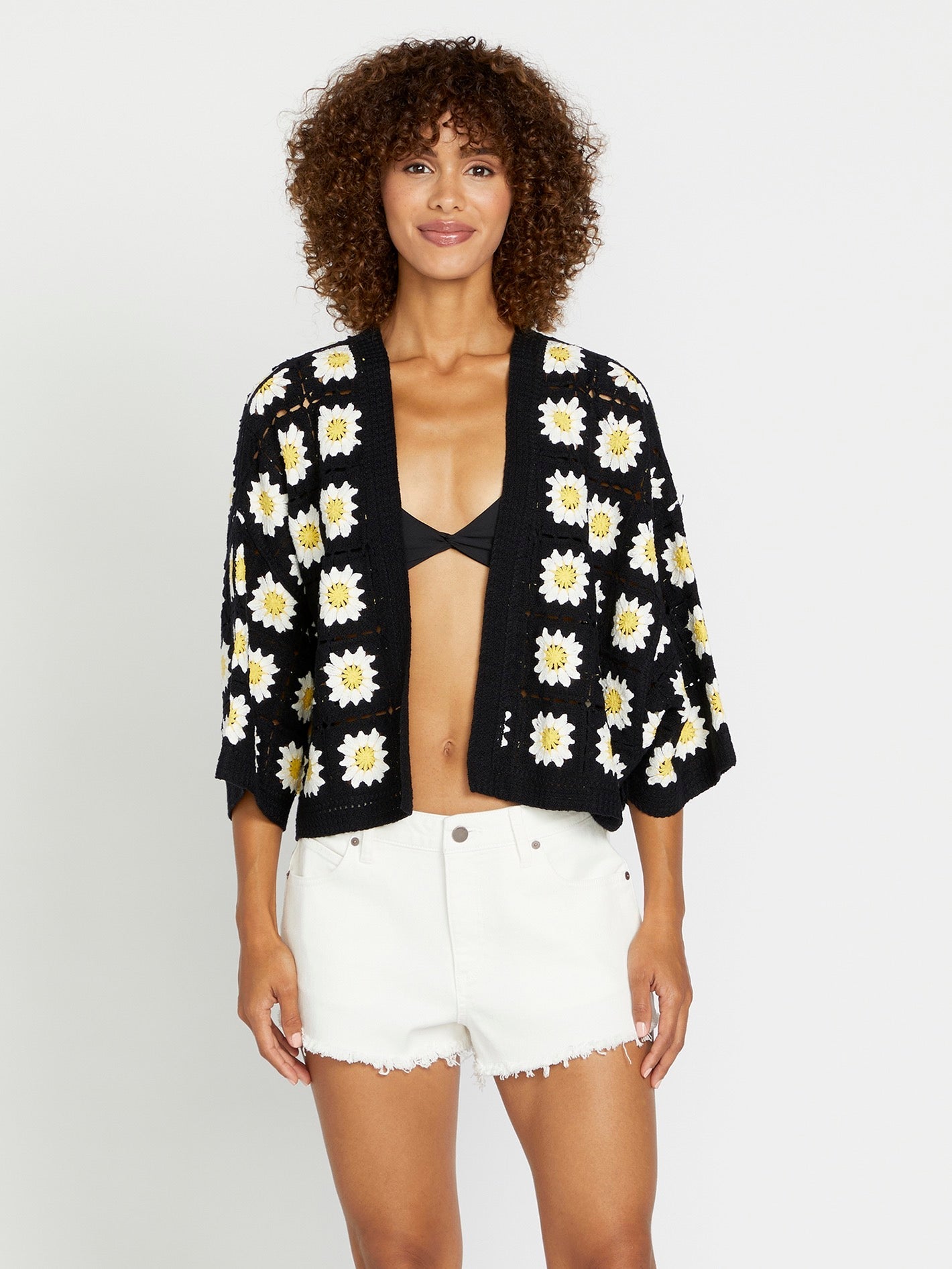 We're not talking about your grandma's sweater. "V"'s Daised Daze Shrug is a modern interpretation of the iconic open-front style pairing a daisy crochet knit design with voluminous Dolman sleeves.