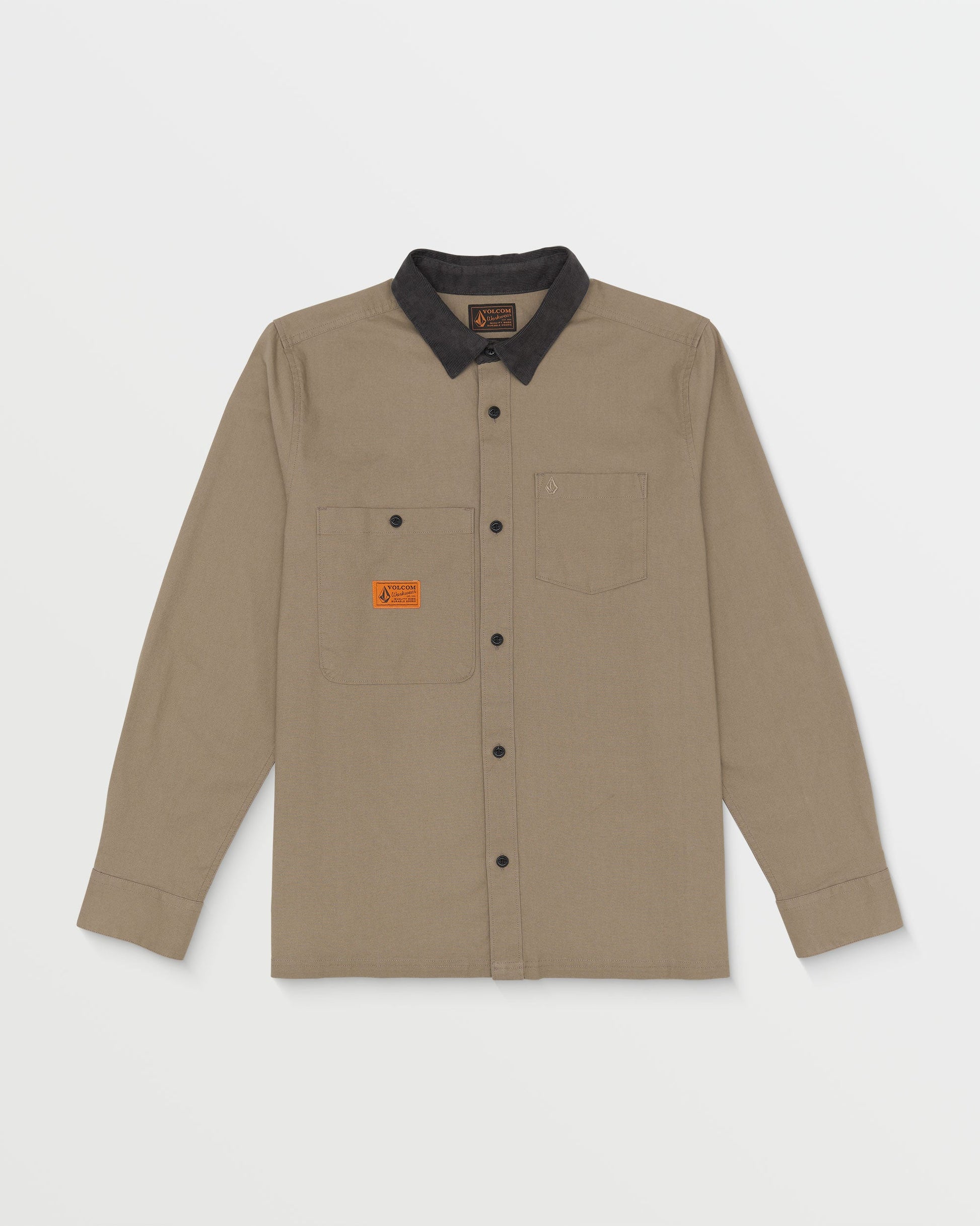 The Debasser is a "V" Workwear classic. Made with a durable 97% cotton-canvas blend, this long sleeve shirt stands out with its contrast corduroy collar. Featuring an oversized right chest pocket and embroidered left pocket, it's functional and stylish on all fronts. Featured here in teak.