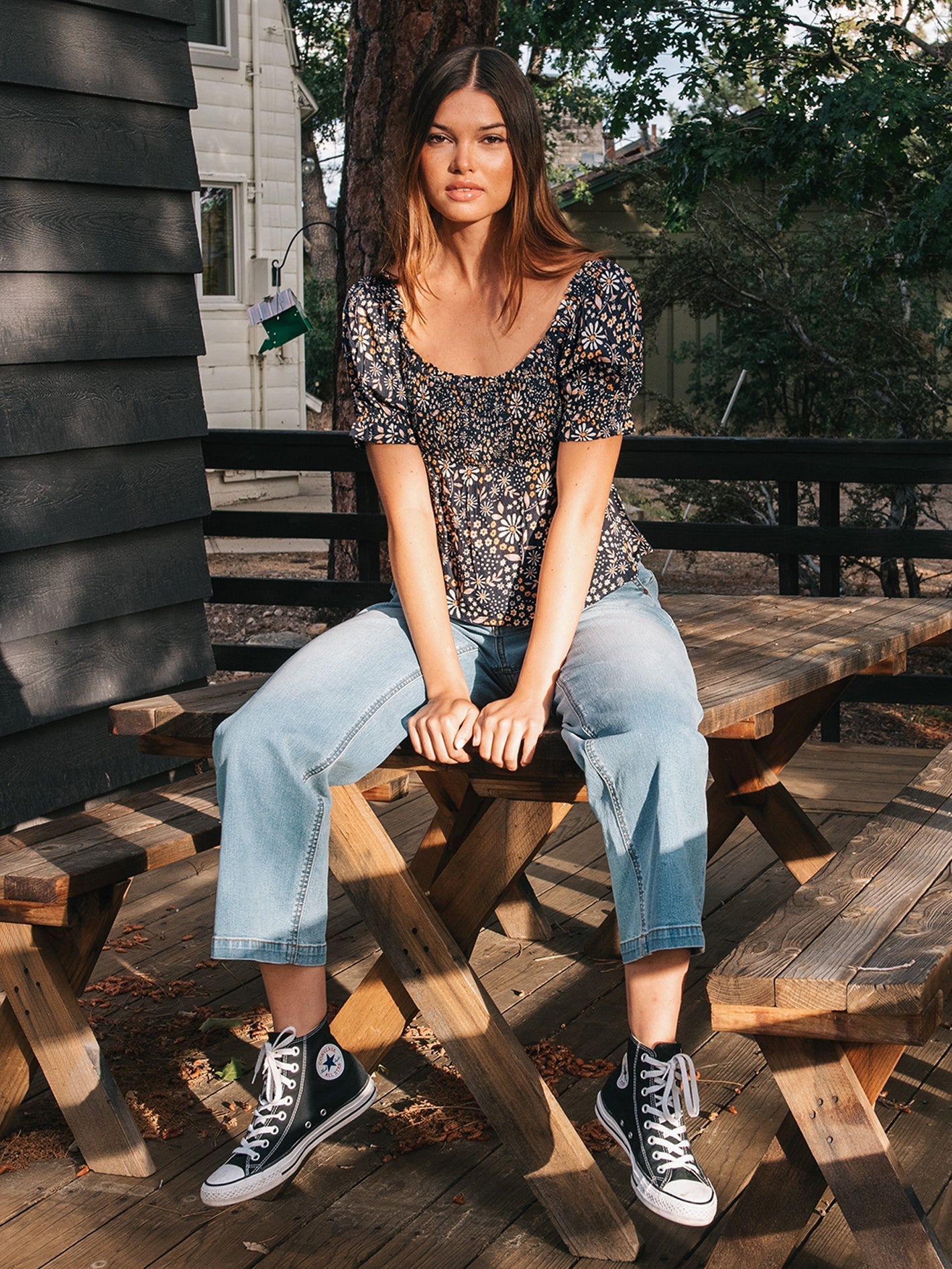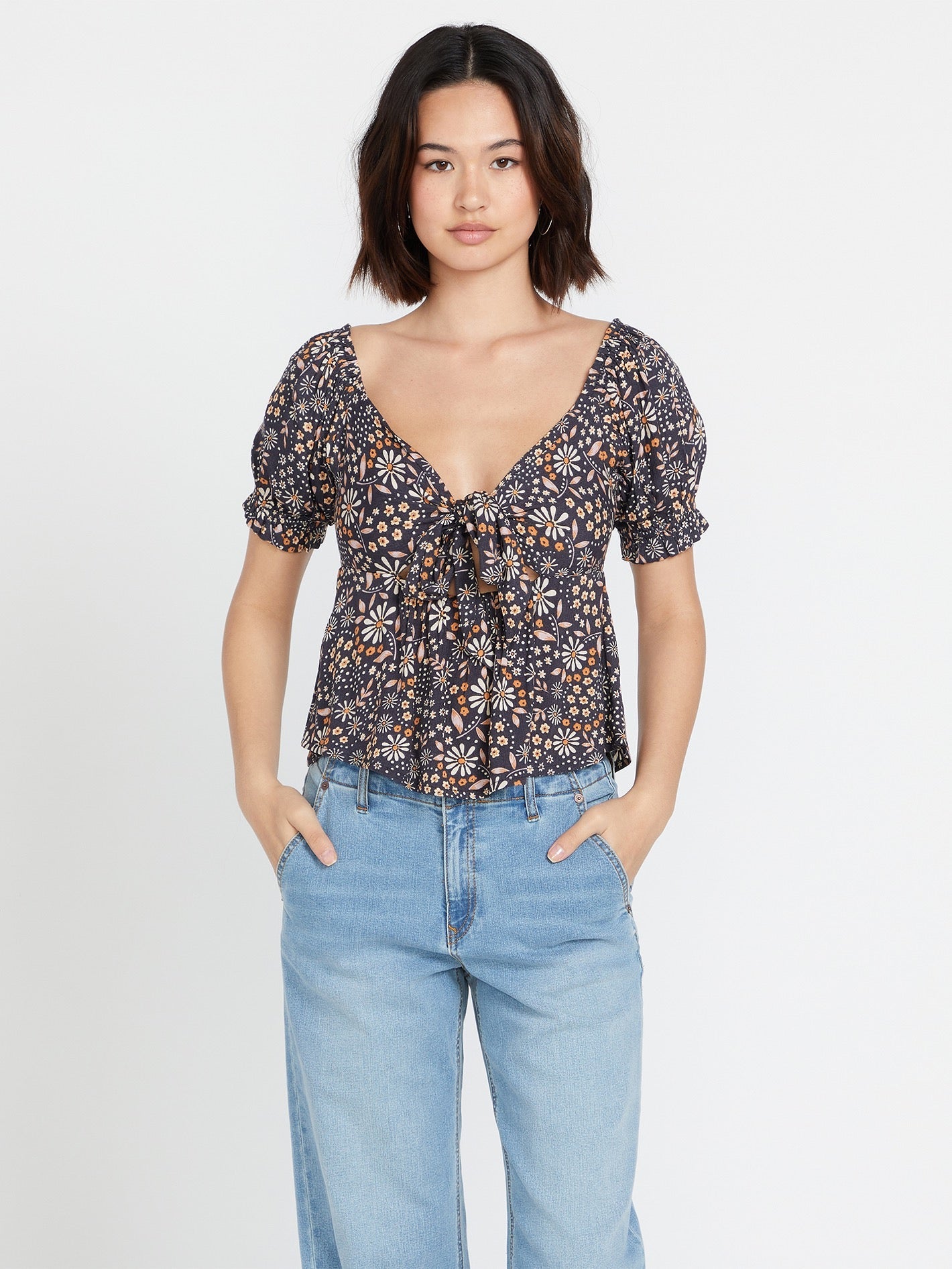 • Reversible allover discharge printed short puff sleeved top with empire waist