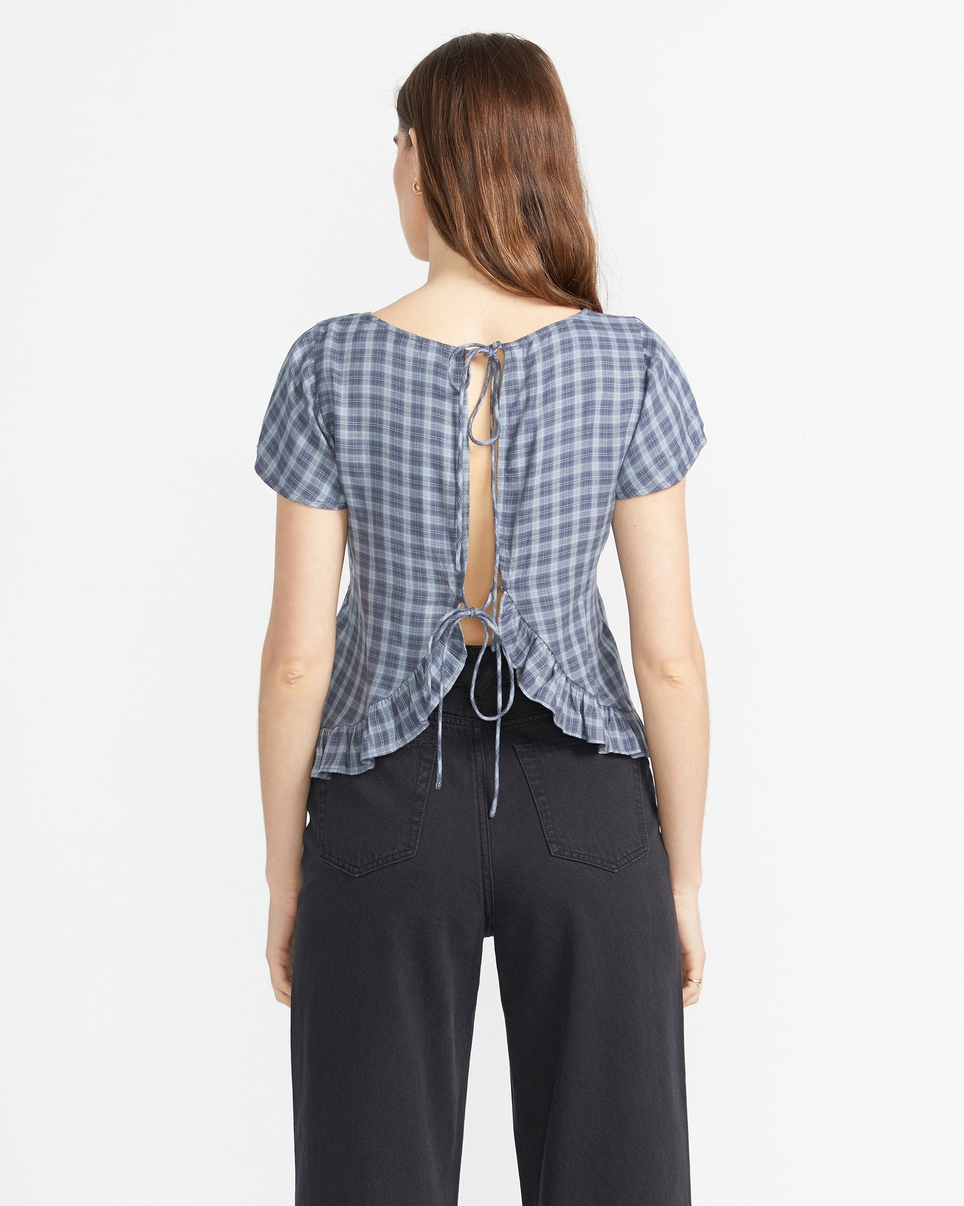 Take casual to the next level with this flattering top. The empire waist and V-neck create a feminine silhouette, while fly-away back panels add a breezy touch. Crafted from soft viscose plaid, it features cap sleeves and a ruffled hem for versatile charm. Adjustable ties and a metal badge complete this effortlessly chic look. Featured here in vintage navy.