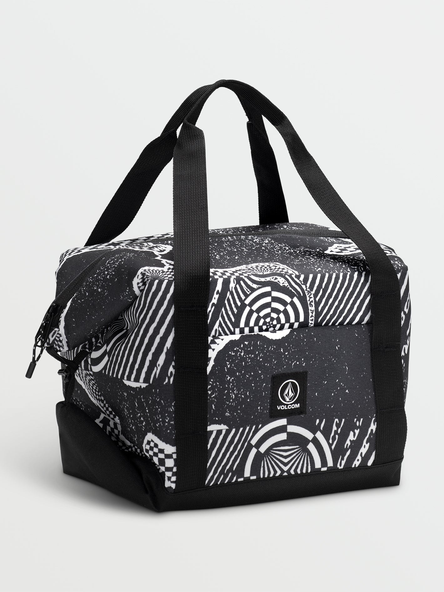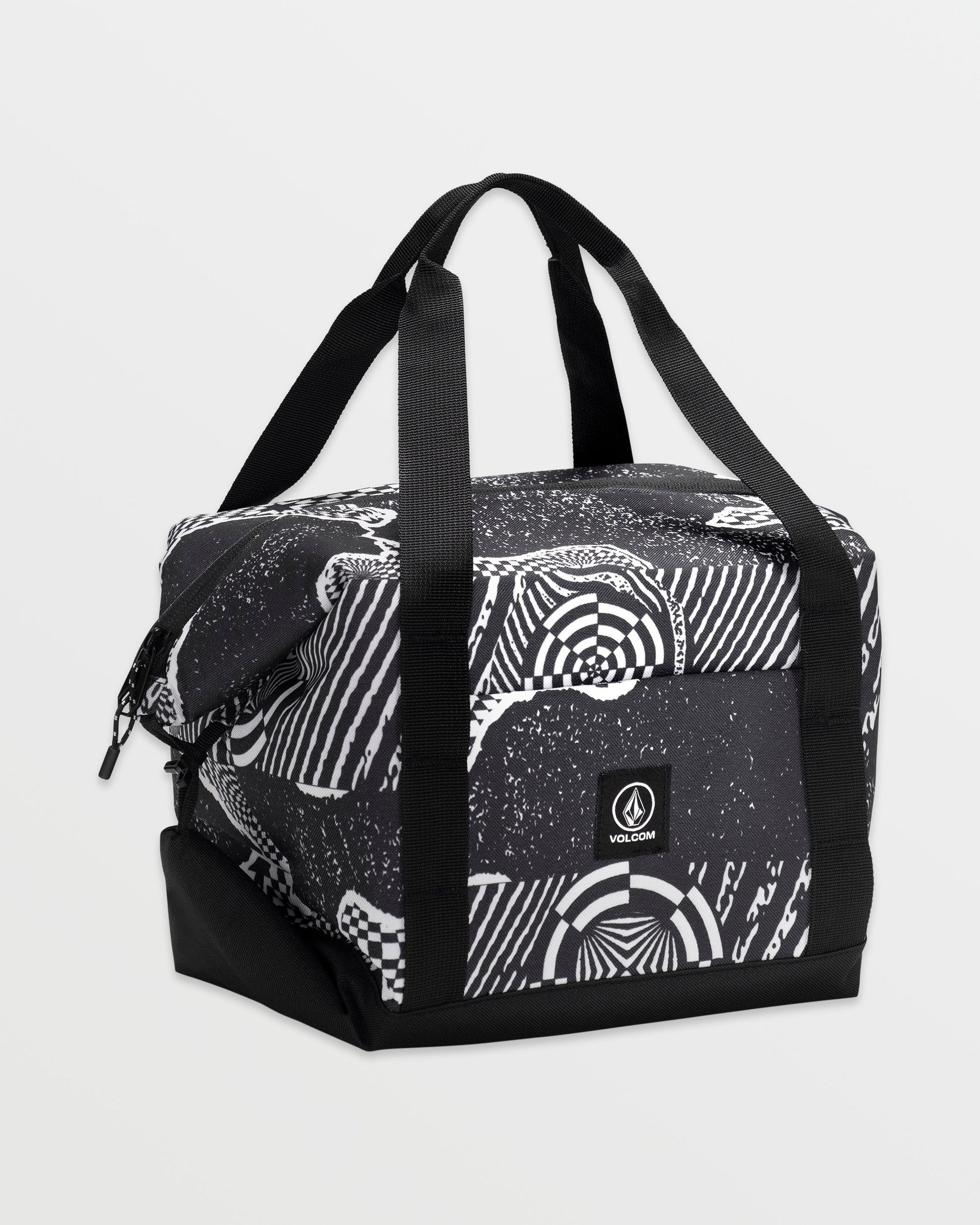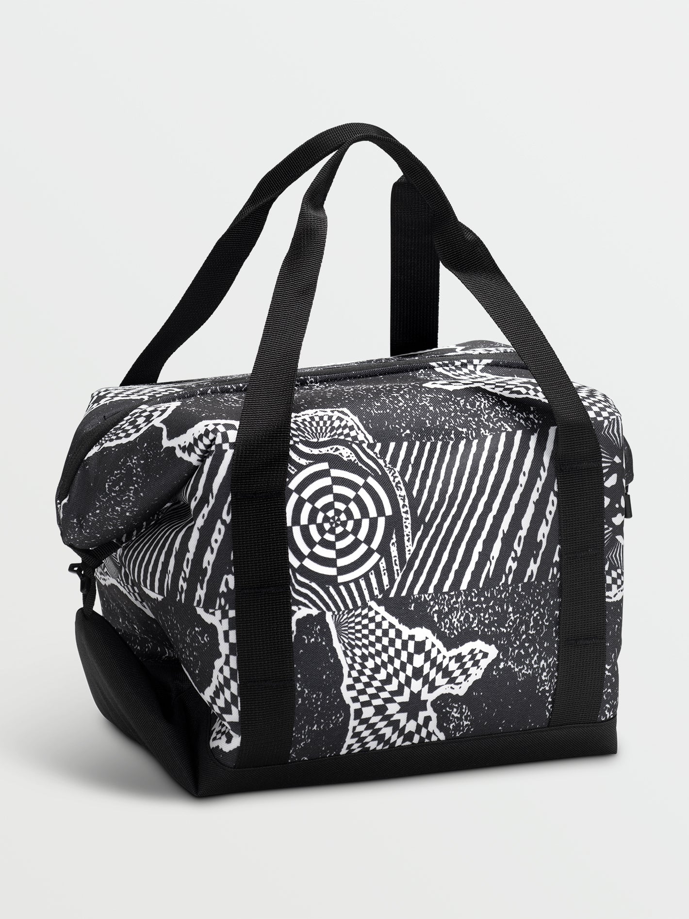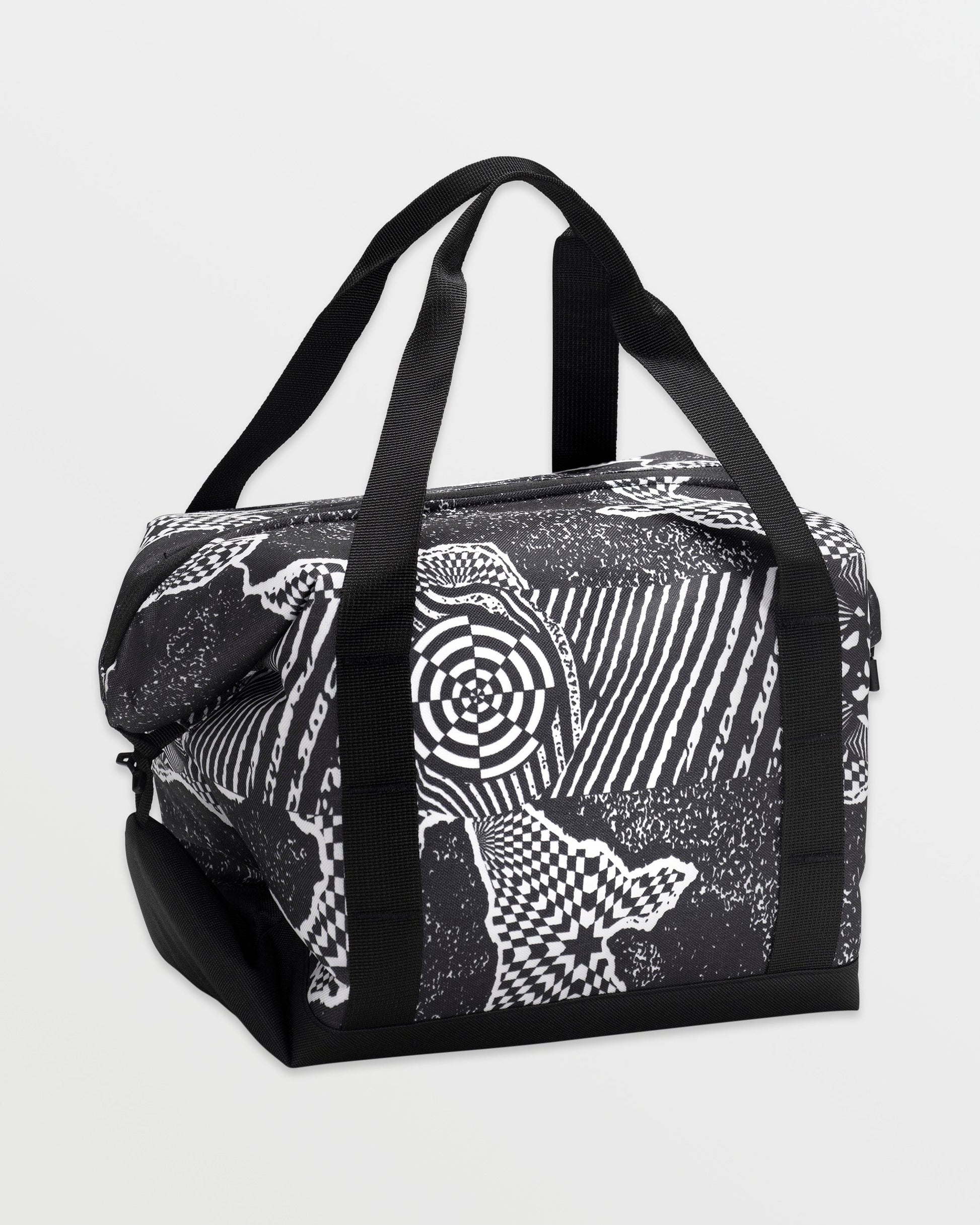 The Out There Cooler is a spacious and durable cooler bag designed to fit up to 14 12oz cans. It features a large main zipper compartment and a front slip pocket for easy organization. The bag is made of 100% Polyester 600D with TPE Backing and has a PEVA Liner for insulation. When not in use, the bag can be collapsed to a more compact size. The double layered carry straps ensure comfortable transportation, and the heat-sealed interior seams prevent leaks. Perfect for keeping your drinks and snacks cool on the go. Featured here in black white.