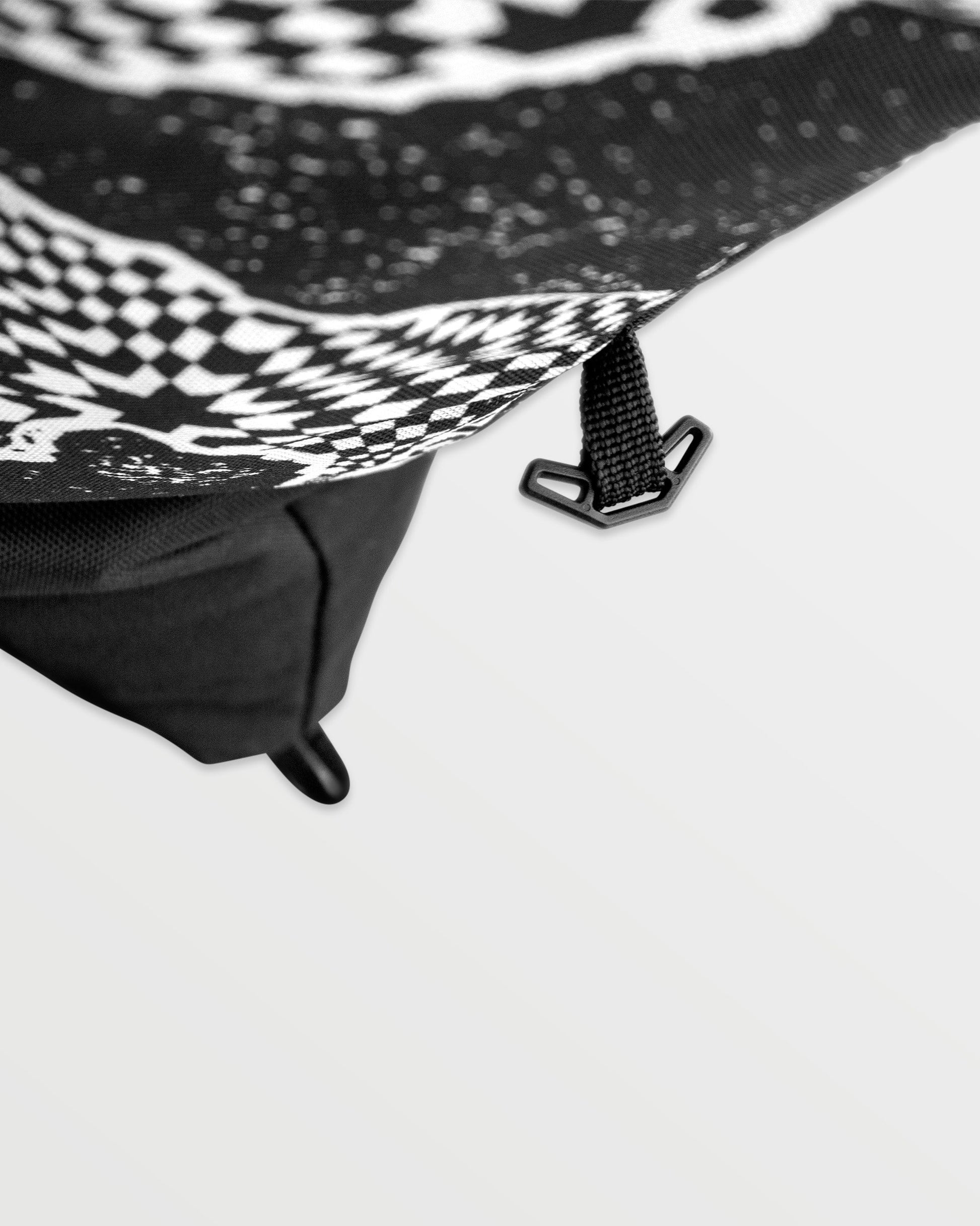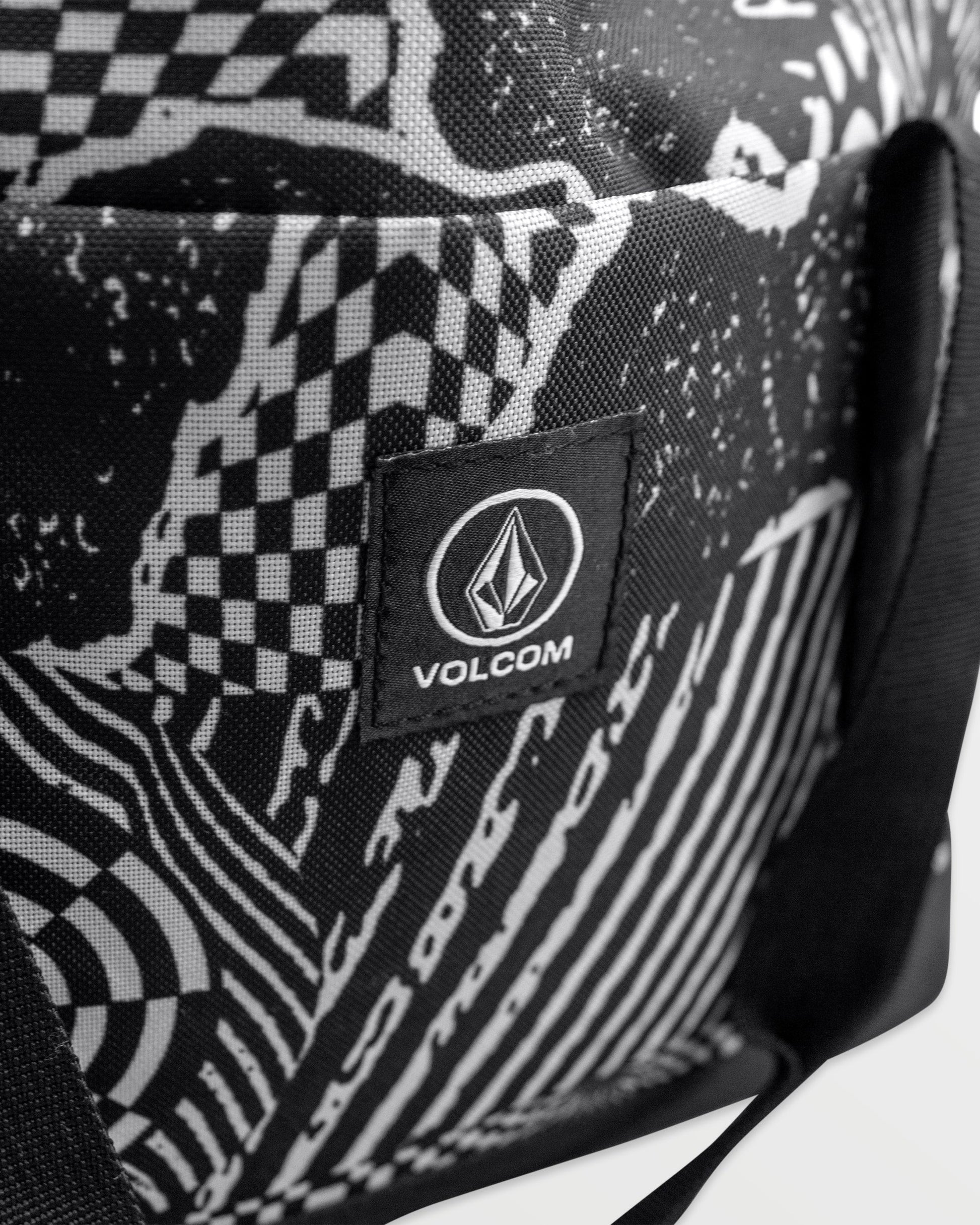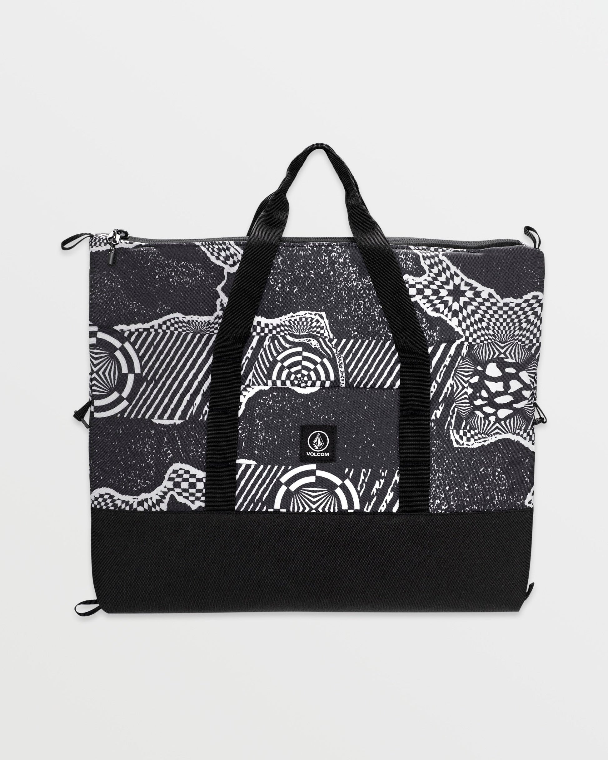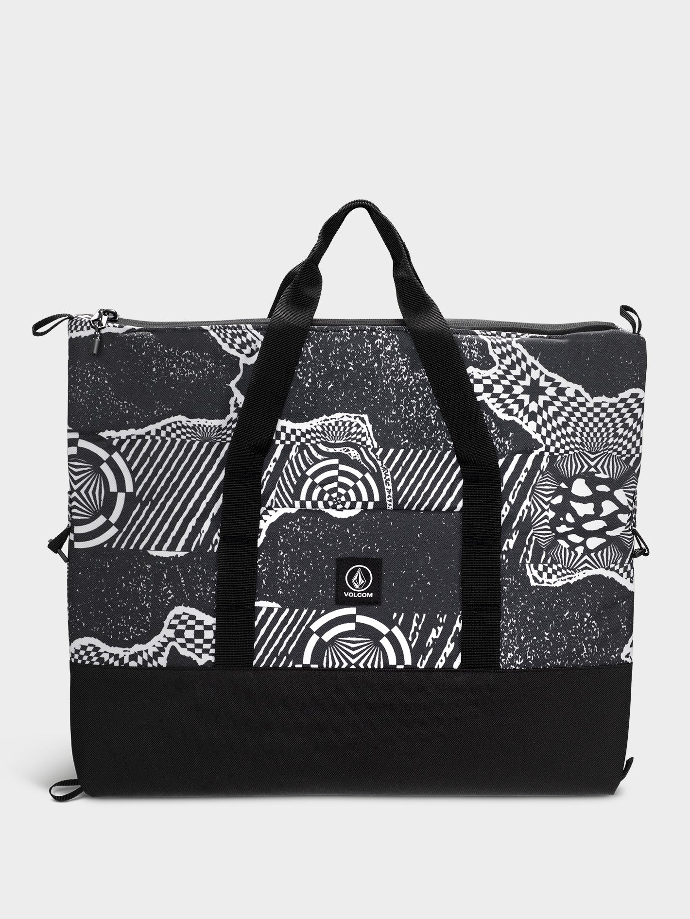 The Out There Cooler is a spacious and durable cooler bag designed to fit up to 14 12oz cans. It features a large main zipper compartment and a front slip pocket for easy organization. The bag is made of 100% Polyester 600D with TPE Backing and has a PEVA Liner for insulation. When not in use, the bag can be collapsed to a more compact size. The double layered carry straps ensure comfortable transportation, and the heat-sealed interior seams prevent leaks. Perfect for keeping your drinks and snacks cool on the go. Featured here in black white.