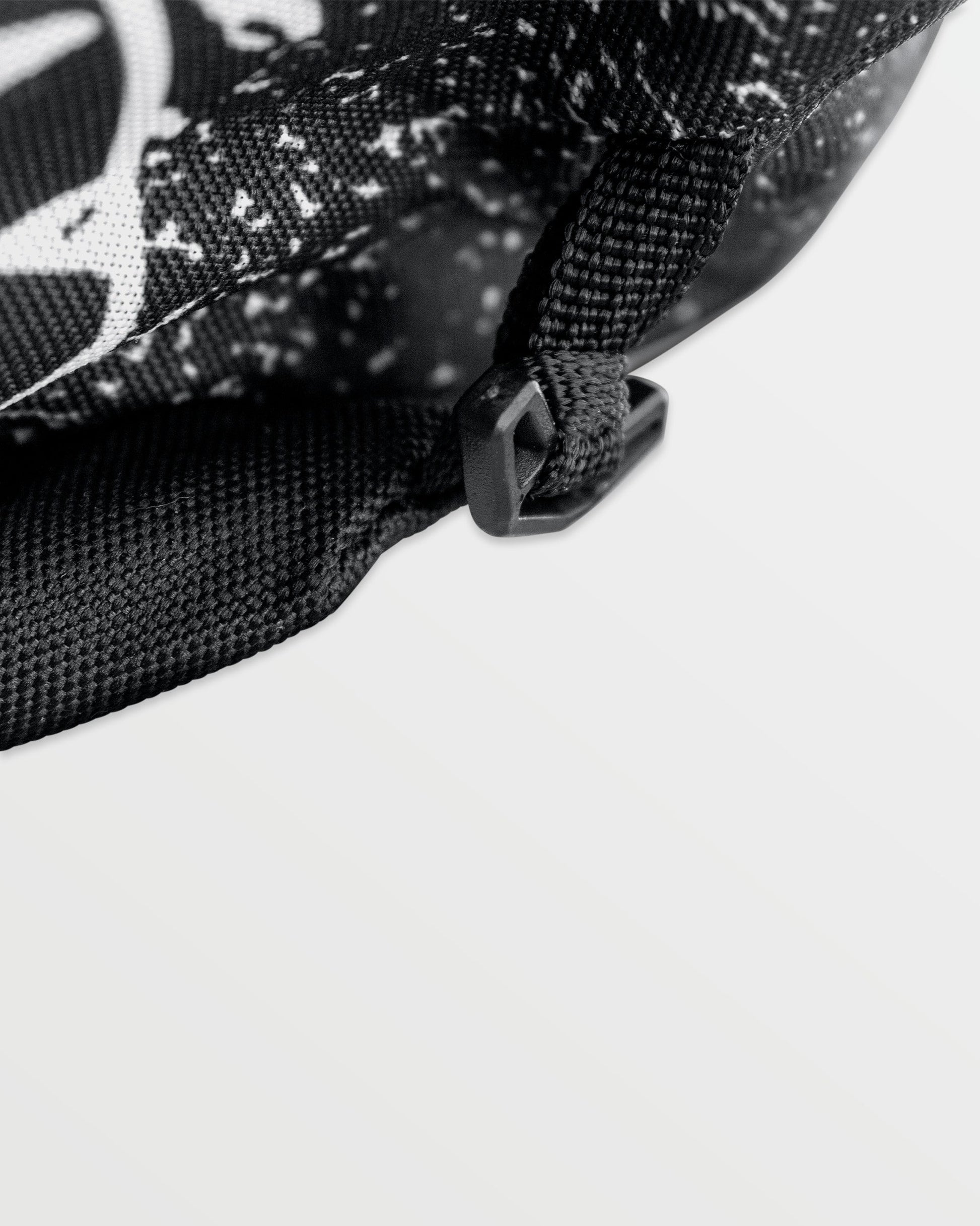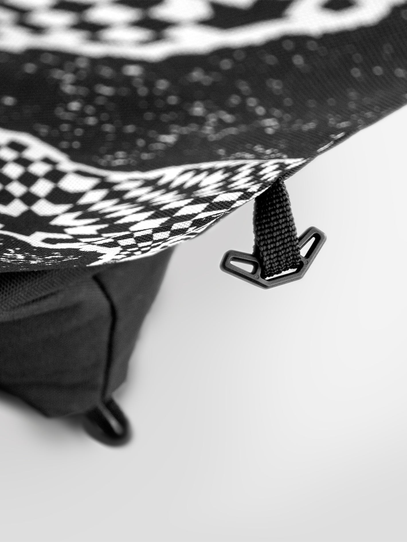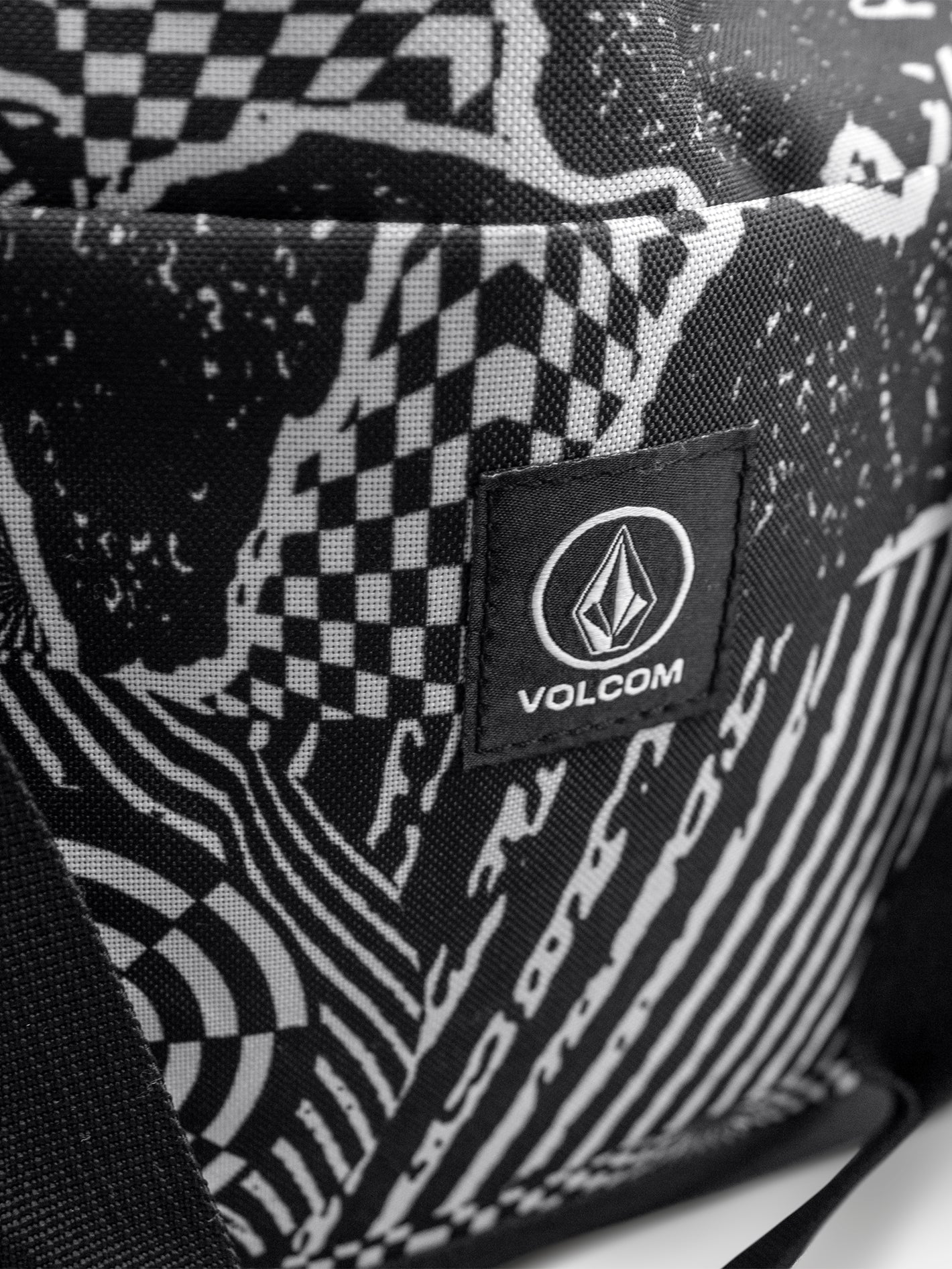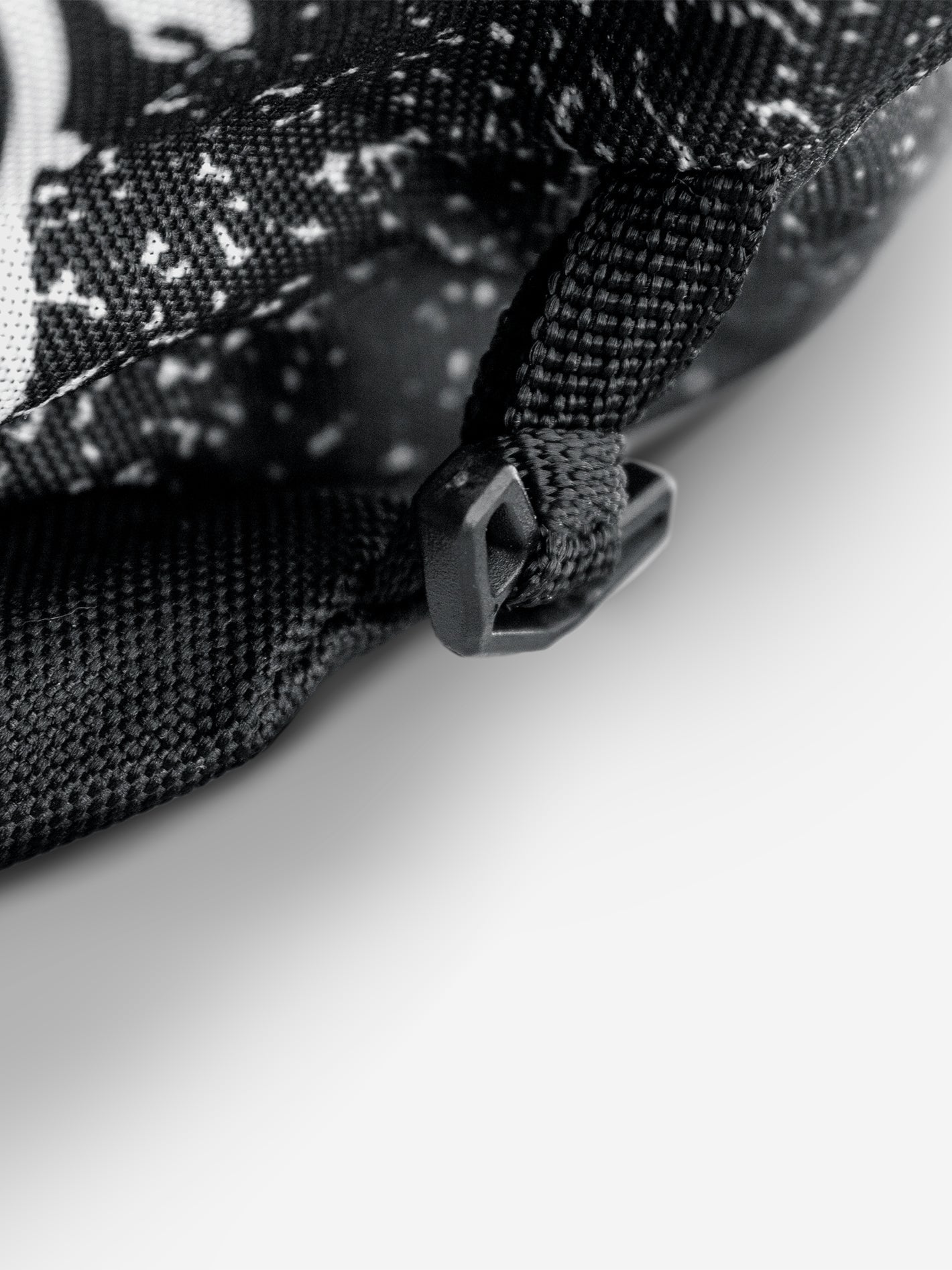 The Out There Cooler is a spacious and durable cooler bag designed to fit up to 14 12oz cans. It features a large main zipper compartment and a front slip pocket for easy organization. The bag is made of 100% Polyester 600D with TPE Backing and has a PEVA Liner for insulation. When not in use, the bag can be collapsed to a more compact size. The double layered carry straps ensure comfortable transportation, and the heat-sealed interior seams prevent leaks. Perfect for keeping your drinks and snacks cool on the go. Featured here in black white.