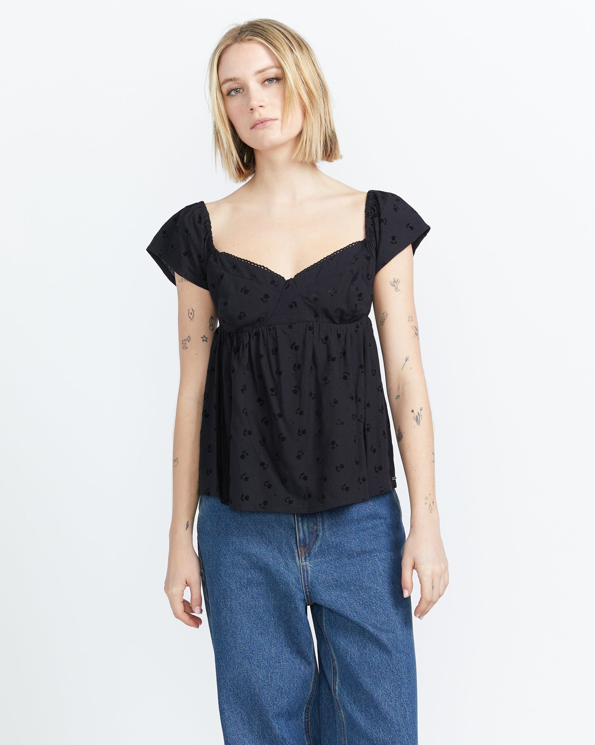 Embrace your flirty side with this breezy cap-sleeved top. The corseted bodice and smocked back panel create a flattering silhouette, while delicate lace trim adds a feminine touch. Crafted from soft viscose gauze with an allover print, it's perfect for beach days or casual outings. The metal badge detail completes this versatile summer essential. Featured here in rust.