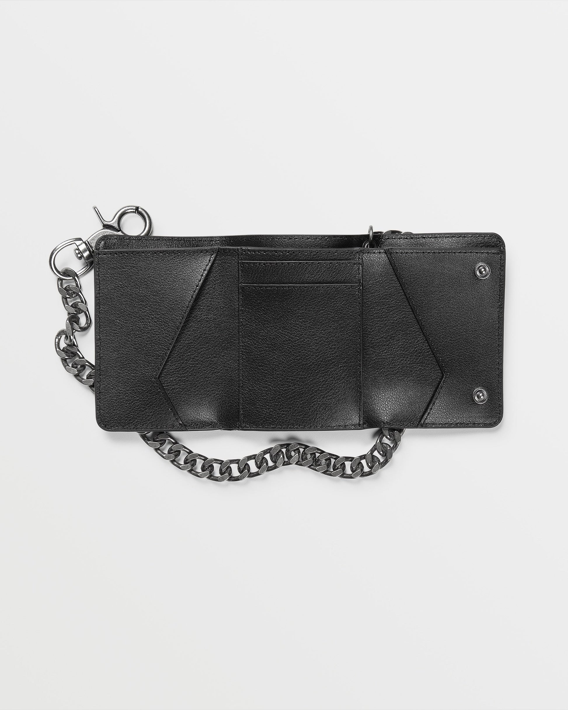 This rugged Pistol Leather Wallet from "V" is a stylish sidekick that means business. Crafted from premium 100% leather, it features a classic bi-fold design with a metal chain for secure carrying. This wallet's sleek exterior, metal chain, and debossed logo make for a bold statement. Featured here in black.