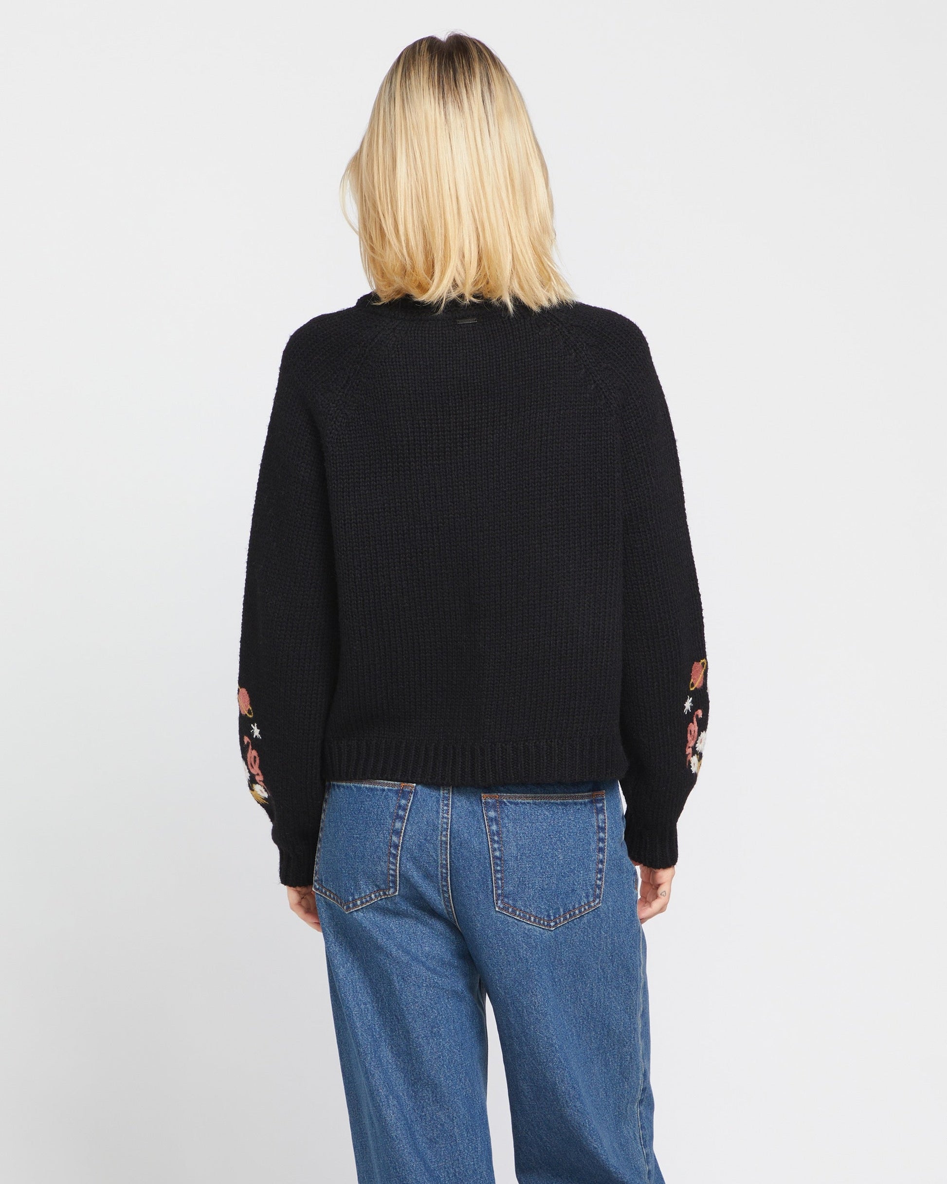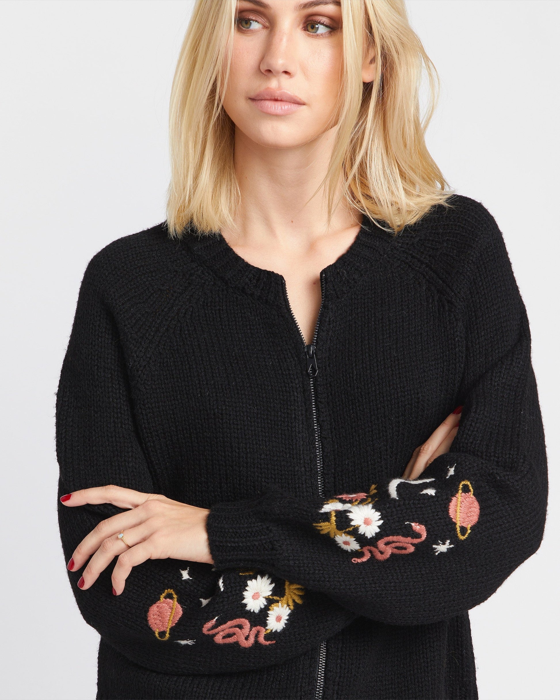 This 100% polyester bomber-style jacket features a wide collar, blouson sleeves, and celestial desert-themed embroidery for a bold, eye-catching look. The metal zipper and badge add a touch of edge to this versatile, everyday essential. Featured here in black.