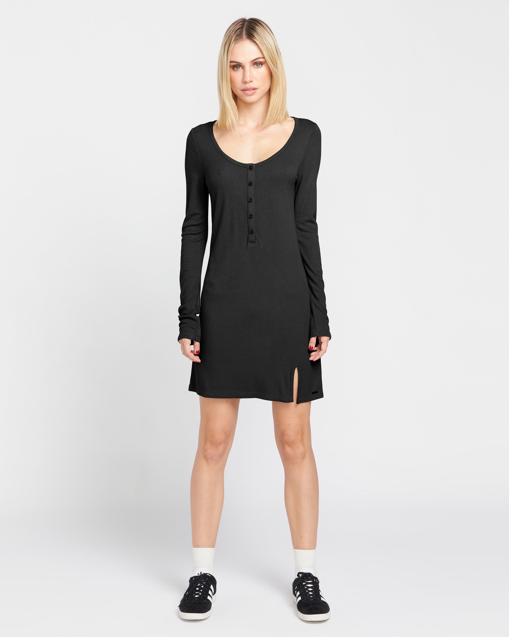 • Long sleeved mini dress with scoop neck and henley button placket
