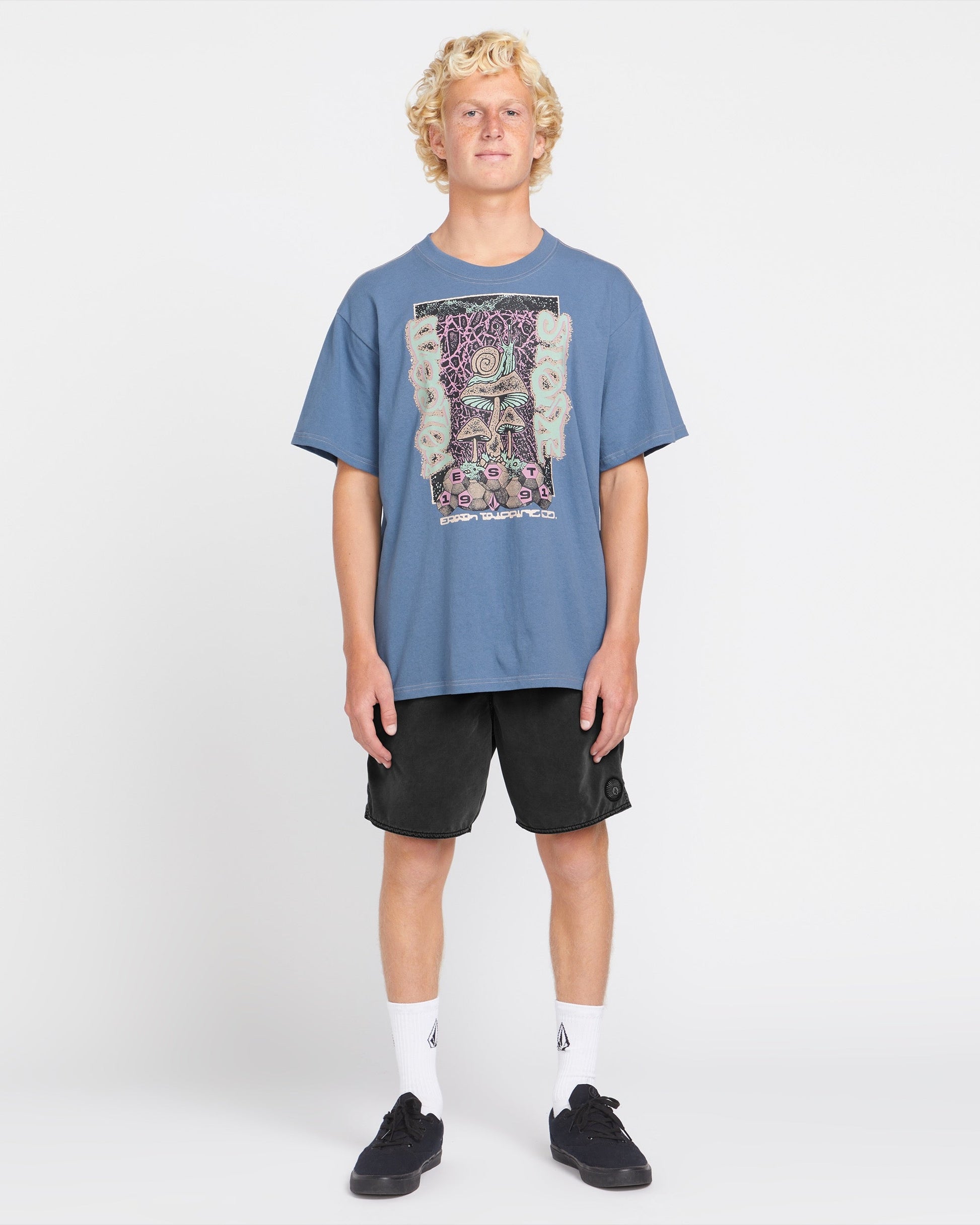 "V"'s Splarg Short Sleeve Tee is a premium cotton essential that's anything but basic. This heavy-weight tee boasts a soft, wide fit and a bold, screen-printed design that glows under black light. Featured here in blue.