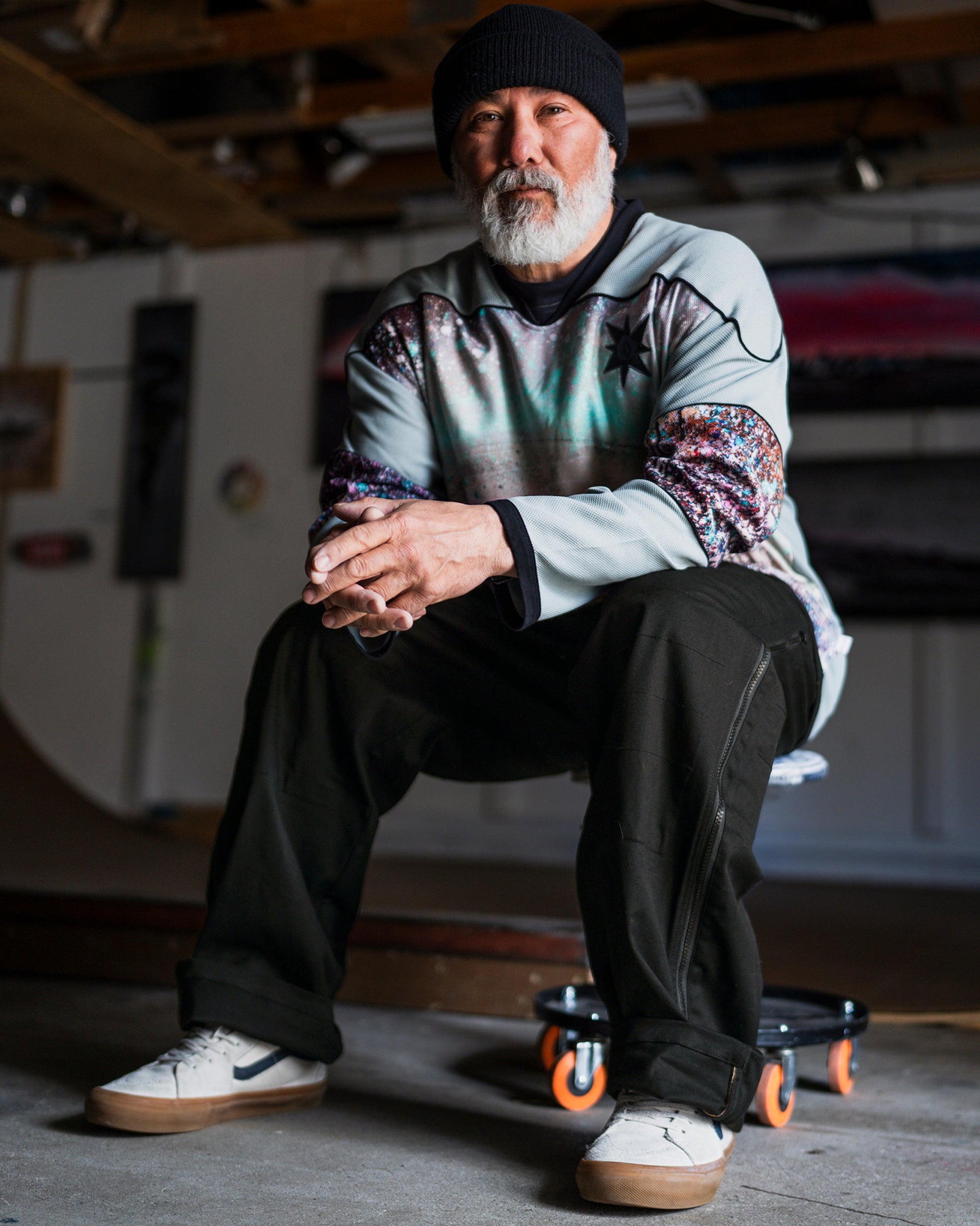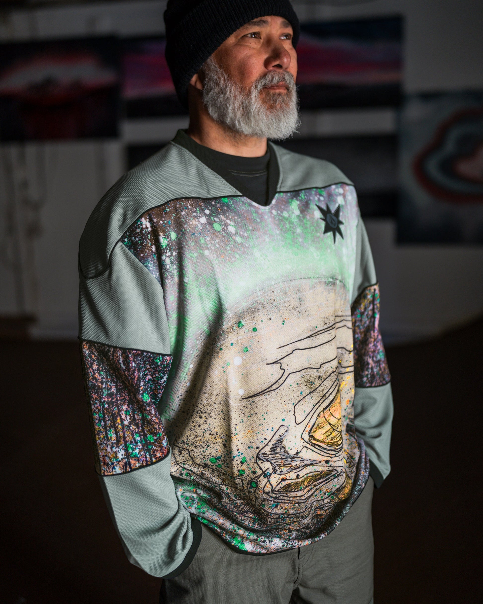 Bryan Iguchi, the legendary snowboarder, partnered with our "V" design team to bring you the Tokyo True collaboration, blending his Japanese heritage and global cult following into a project that resonates universally. This knit long sleeve delivers truly unique style. The 100% polyester mesh fabric offers a loose, breathable fit, while the allover print and hockey-style neck add a sporty, streetwear-inspired look. Featured here in green.